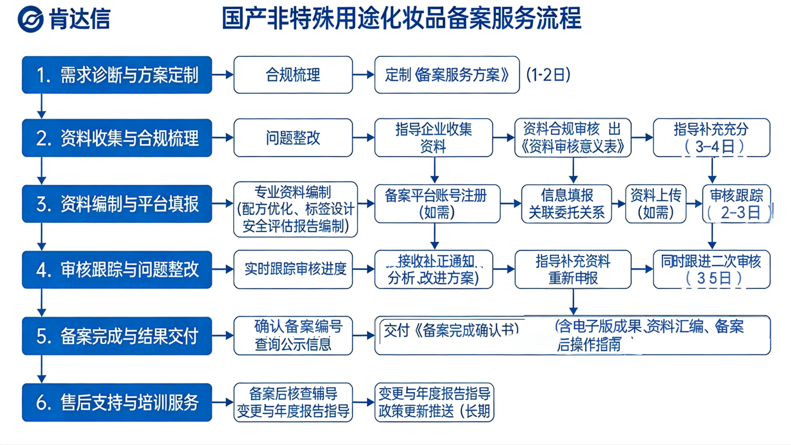 • 提供《广东国产非特殊用途化妆品备案资料清单》(含官方要求 + 肯达信补充项),指导企业收集以下核心资料: