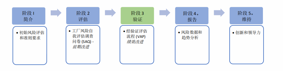 VAP 是整体供应商参与模式的一部分:评估并改善供应链中的劳工、健康与安全、环境和道德实践的过程。这是一项利用 RBA 批准的评估员、RBA 制定的评估流程和协议、由第四方 AQM 或 RBA 质量管理部门进行的
