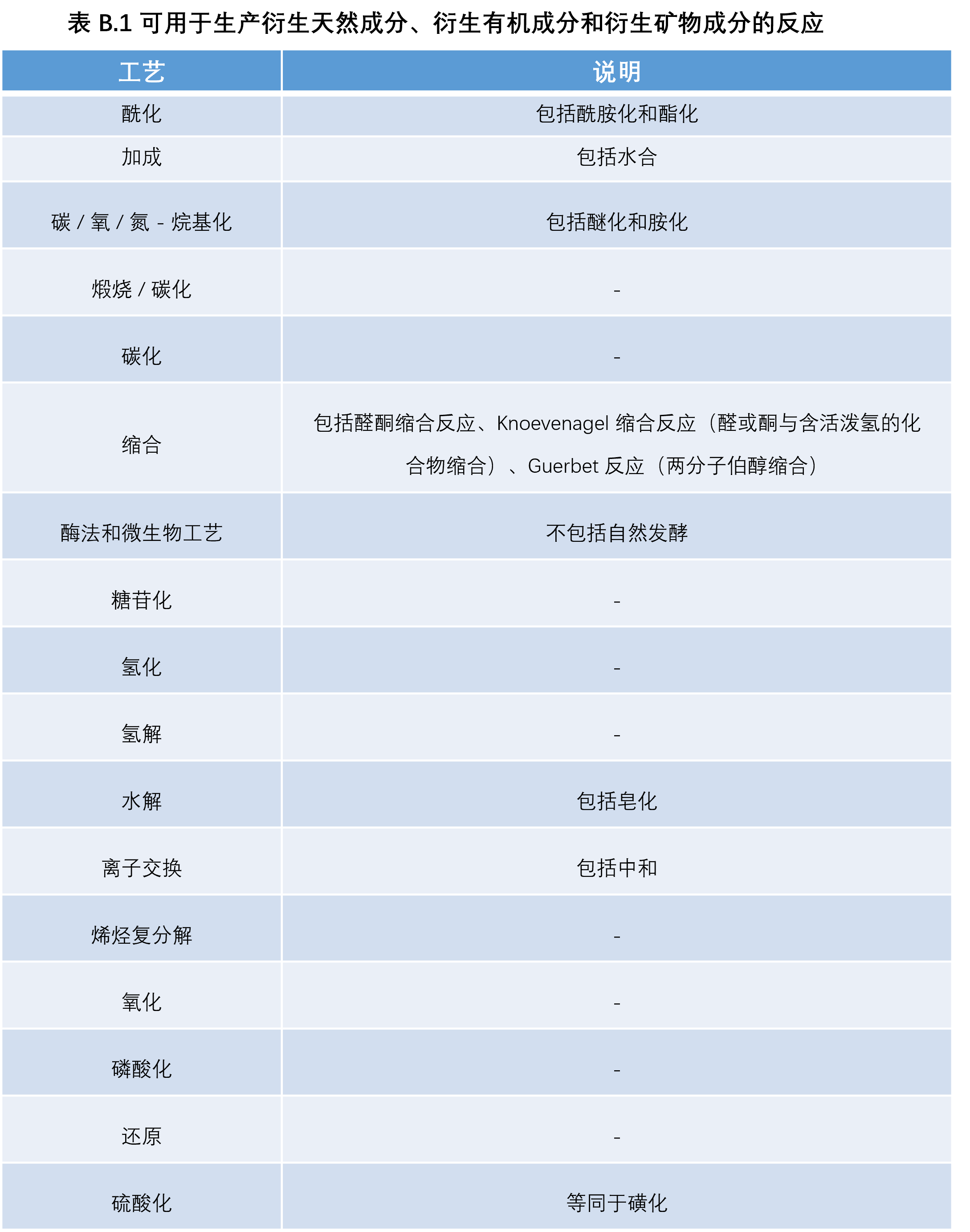 天然衍生成分是通过特定化学或生物过程获得、旨在进行化学改性的化妆品成分,按分子量、可再生碳含量等方法计算,其天然来源比例需超过 50%。此类工艺的合规清单见表 B.1