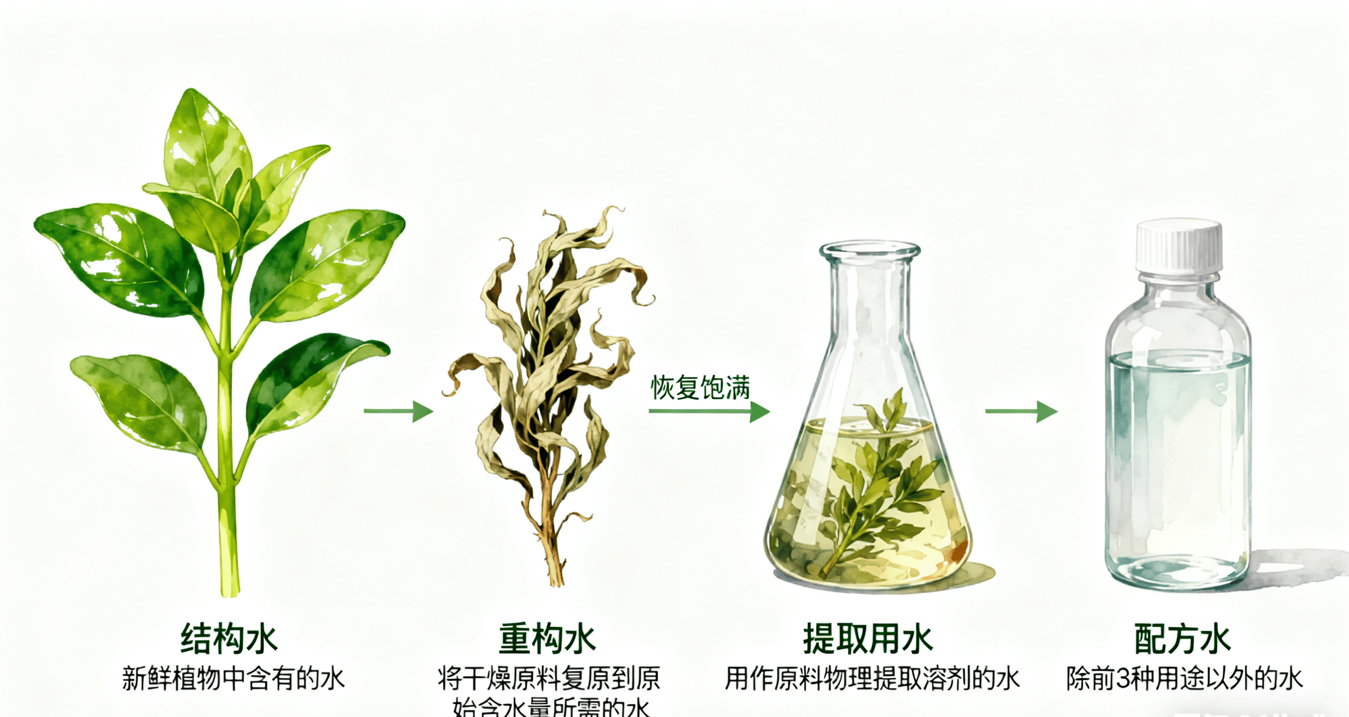 对于使用水提取的干燥植物提取物,提取用水按公式(3)👇计算: