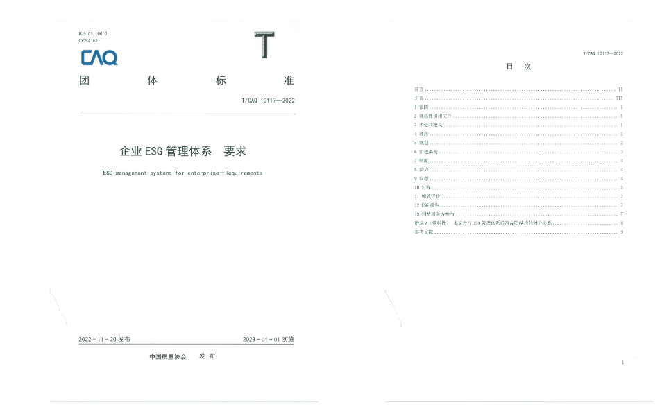 2022年,为响应国务院国资委发布的《提高央企控股上市公司质量工作方案》中“中央企业集团公司要统筹推动上市公司完整探索建立健全ESG体系”“推动央企控股上市公司ESG专业治理能力、风险管理能力不断提高”等要求,中国质量协会作为牵头机构,组织全国三十余家各行业知名企业编制并发布了《企业ESG管理体系 要求》及《企业ESG评价指南》(团体标准)两项团体标准。