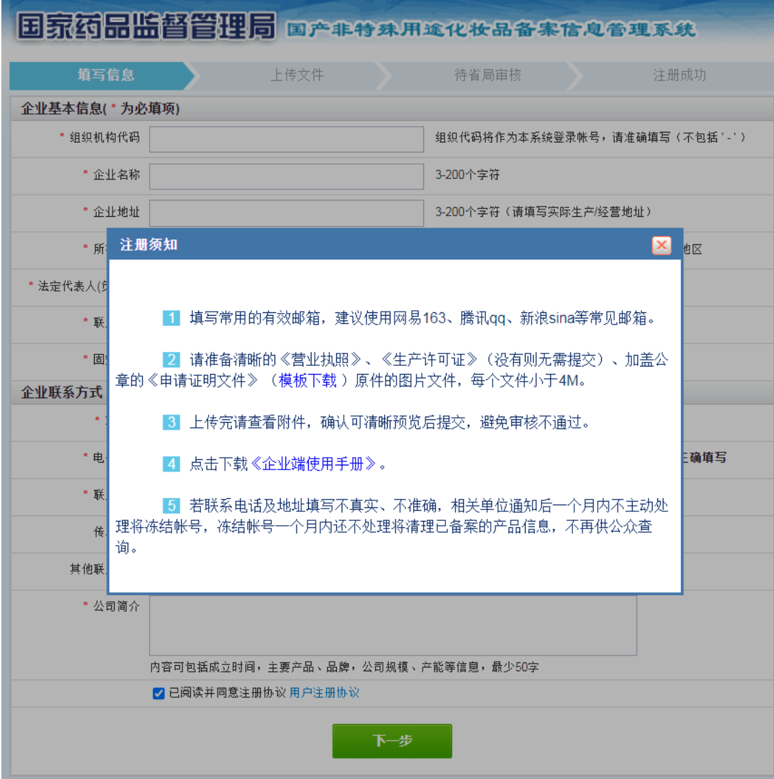 1.4 注意事项:公司简介需要认真填写,委托方需说明被委托方信息,联系电话需要填写真实并能联系上,注册时生产企业需填写质量安全负责人资料;